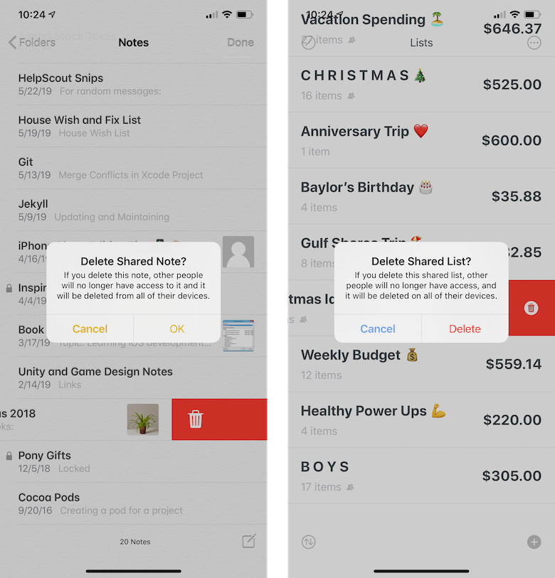 As I want back and forth, I realized that Notes on iOS could also have this same scenario. So, I grabbed a test device and my iPad and recreated it. Their copy had perfect messaging, and so I ended up with much of the same thing for Spend Stack. The only change I made was tweaking “ok” to a destructive “delete” (per Apple’s advice, I may add):