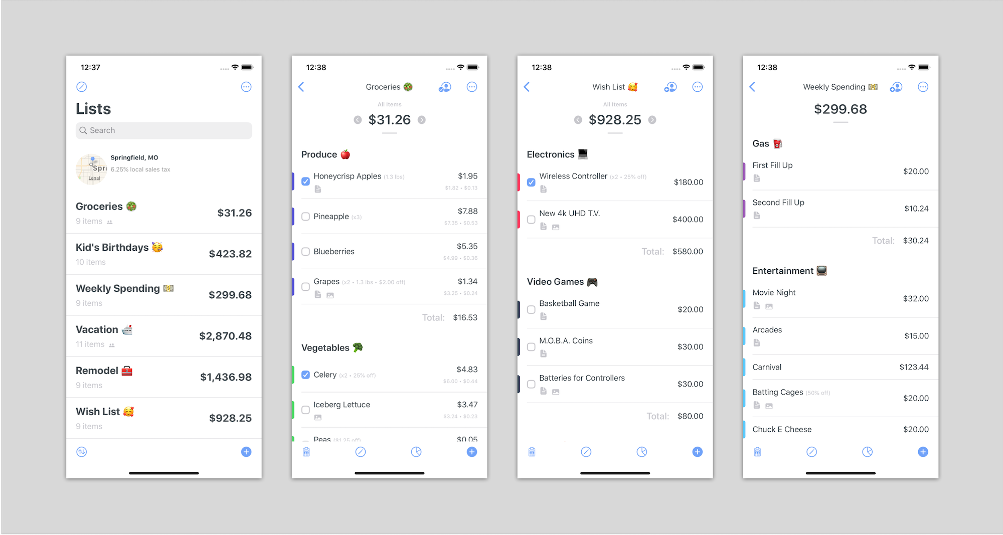 I hit some issues along the way, though. The first and most challenging was around how I chose to tackle demo data. I need quite a bit of it. I wrote a list of lists (meta!) that I wanted to include to best showcase all of the things you can do with Spend Stack. I ended up with a solid line up, and each one was filled with relevant items, images, notes and more: