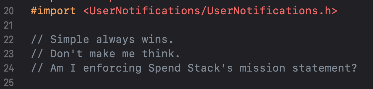 I call these little things “always ask yourself” tips. Almost all of the ones I have written down have to do with design. To me, design is like math. It doesn’t come naturally to me, but I can do it - I just really need to focus a bit harder on it. So plopped right in my app delegate file are these little tips that help me frame my mind for the work I’m about to do: