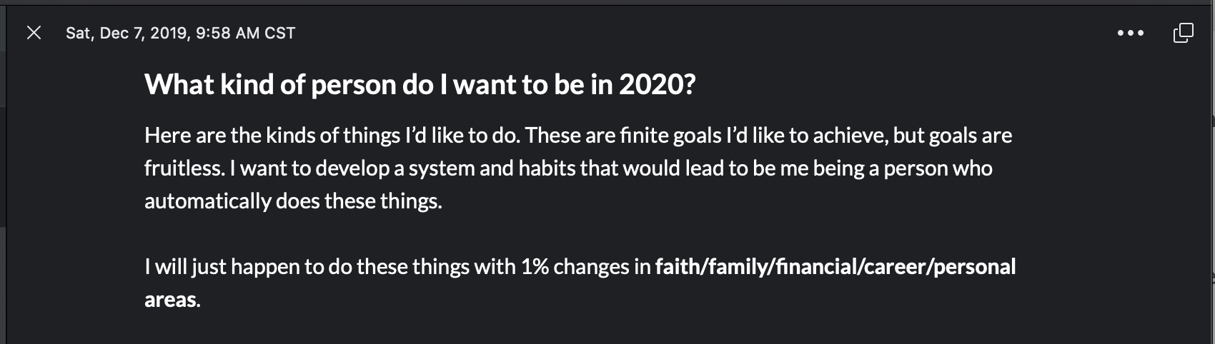 But in 2020, talk is still cheap. I need concrete methods to carry out a plan because hearing it and doing it are two different things. To that end, I’ve found that if I discover who I want to be and what major themes I want to accomplish - I can then formulate smaller goals from that information.